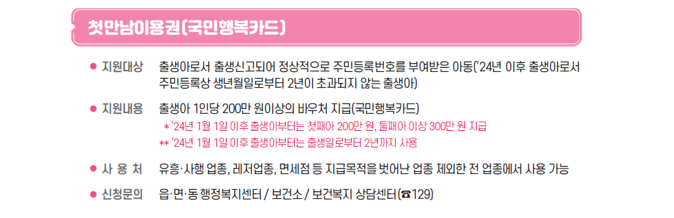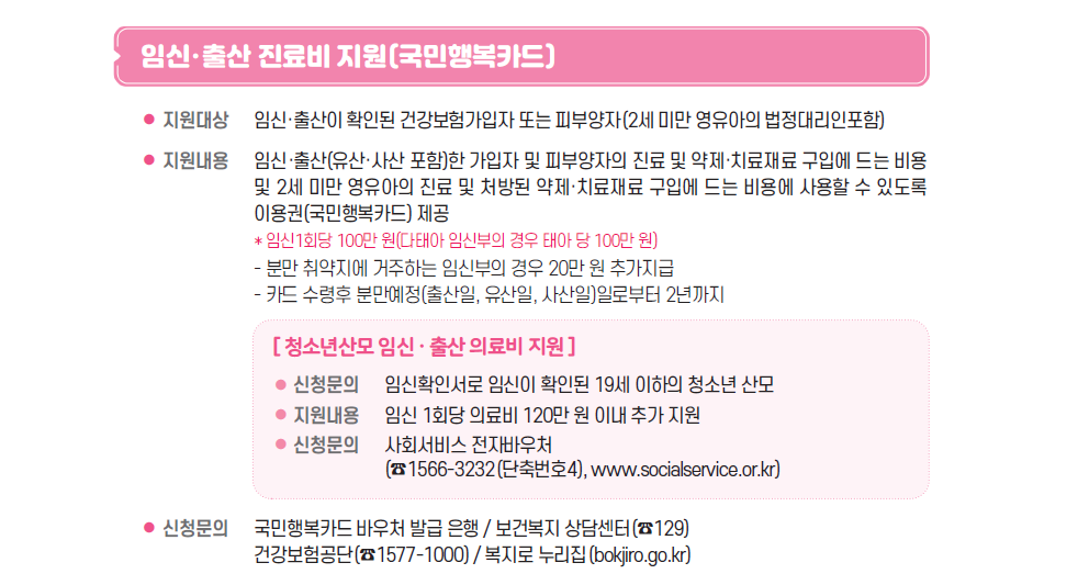 - 지원 내용: 임신·출산 관련 진료 및 약제 구입 비용, 2세 미만 영유아 진료 비용에 국민행복카드 이용권 제공 (임신 1회당 100만 원, 다태아 임신부 태아당 100만원, 분만취약지 임신부 20만원 추가)