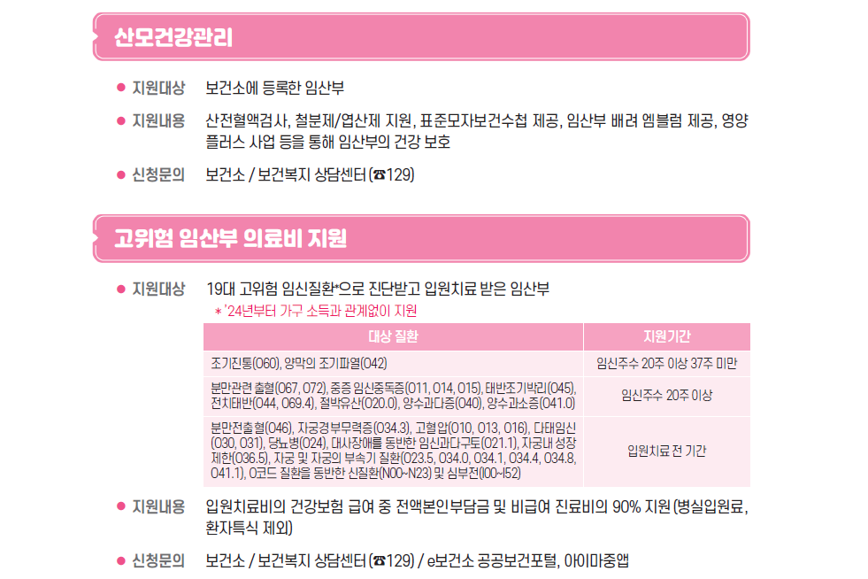 - 지원 대상: 19대 고위험 임신질환으로 입원 치료받은 임산부 (2024년부터 가구 소득과 관계없이 지원)