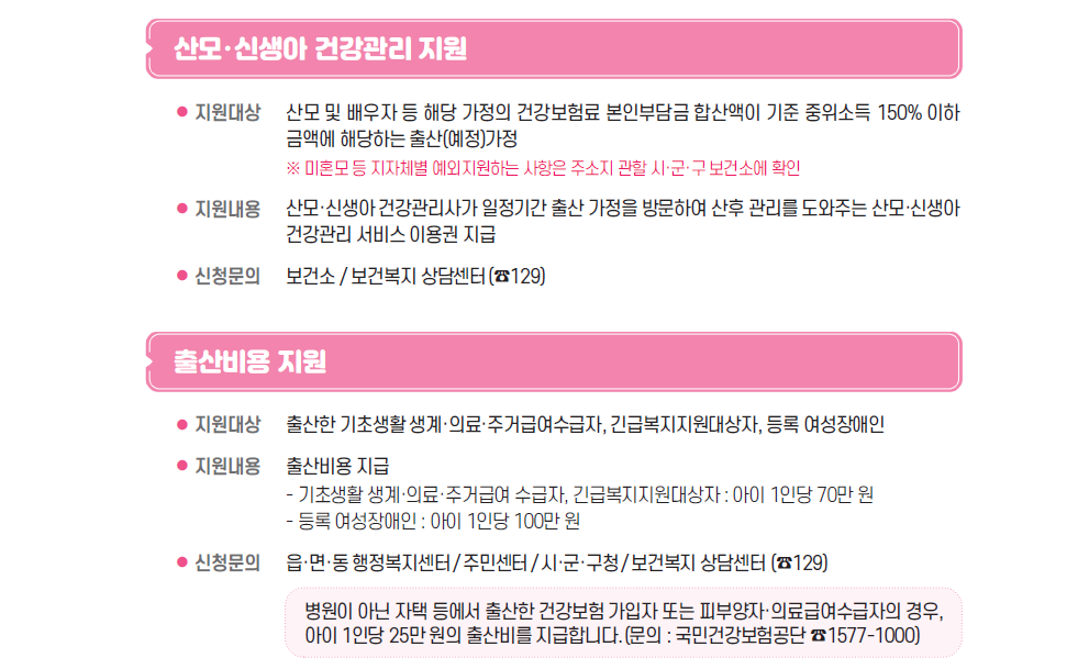 자택 출산 시 특별 지원: 병원이 아닌 자택 출산 시, 아이 1인당 25만원 출산비 지급 (국민건강보험공단 ☎1577-1000)