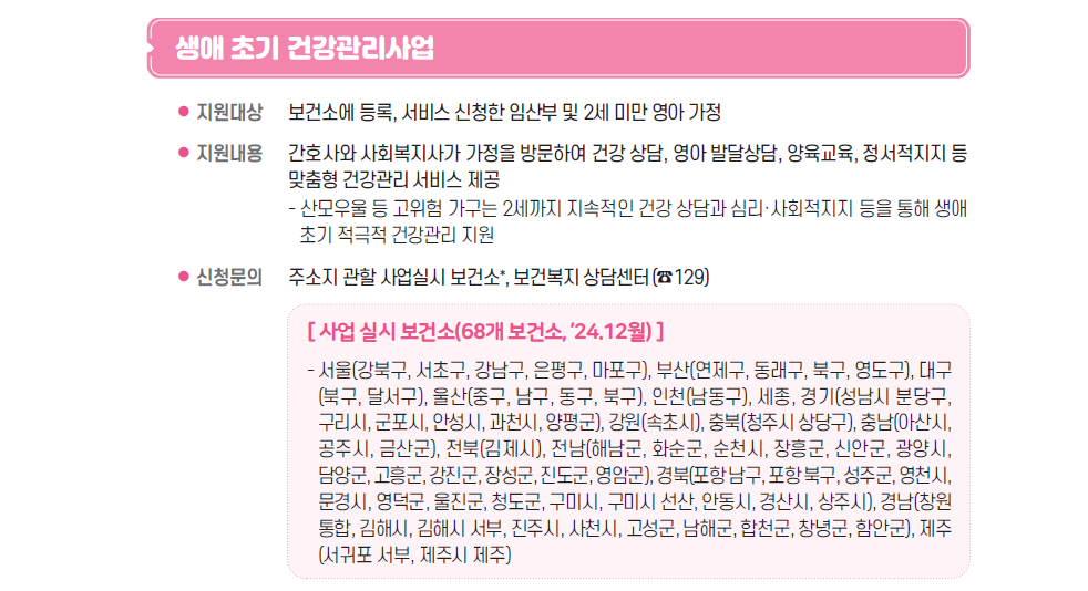 - 지원 내용: 가정 방문 건강 상담, 영아 발달 상담, 양육 교육, 정서적 지지 등 맞춤형 서비스 제공