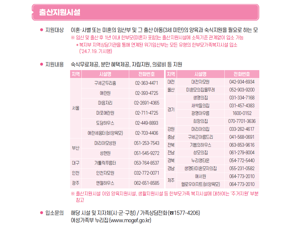 - 지원 대상: 이혼·사별 또는 미혼의 임산부 및 3세 미만 출산 아동 (임신 후 1년 이내 한부모 소득 기준 관계없이 입소 가능, 위기임산부는 모든 유형 한부모가족복지시설 입소 가능)