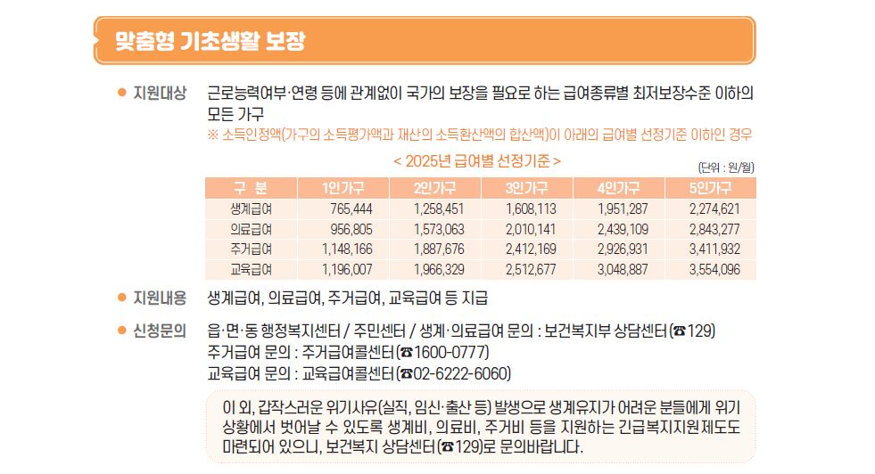 - 문의: 읍면동, 129, 주거급여 콜센터(1600-0777), 교육급여 콜센터(02-6222-6060)