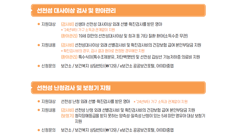 - 대상: 신생아 선천성 대사이상 검사 (24년부터 소득 무관), 19세 미만 환아