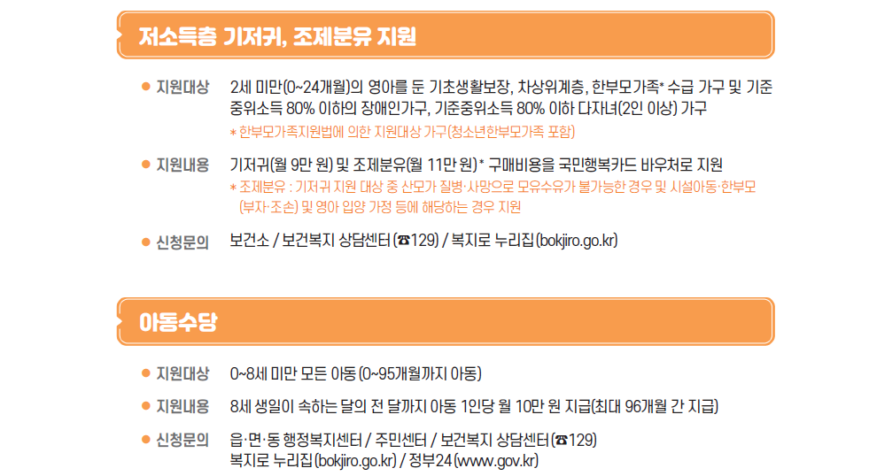 - 지원: 기저귀(월 9만원), 조제분유(월 11만원) 바우처
