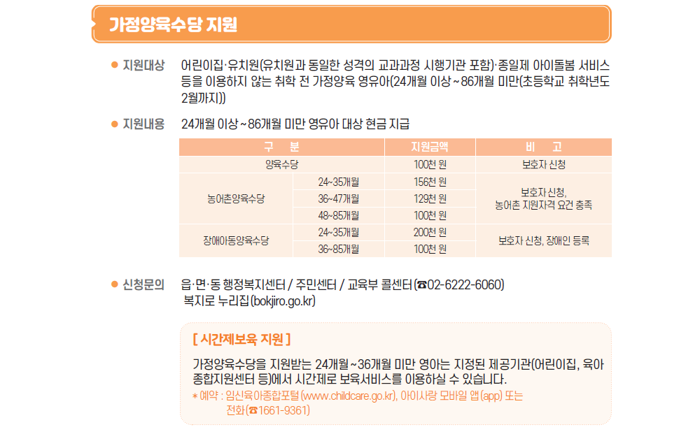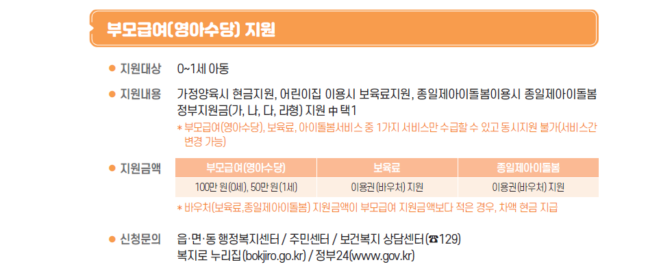 - 지원: 가정양육 시 현금, 어린이집 시 보육료, 아이돌봄 시 정부 지원금