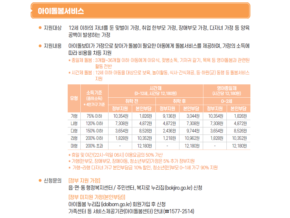 - 지원: 아이돌보미 가정 방문, 소득별 차등 지원