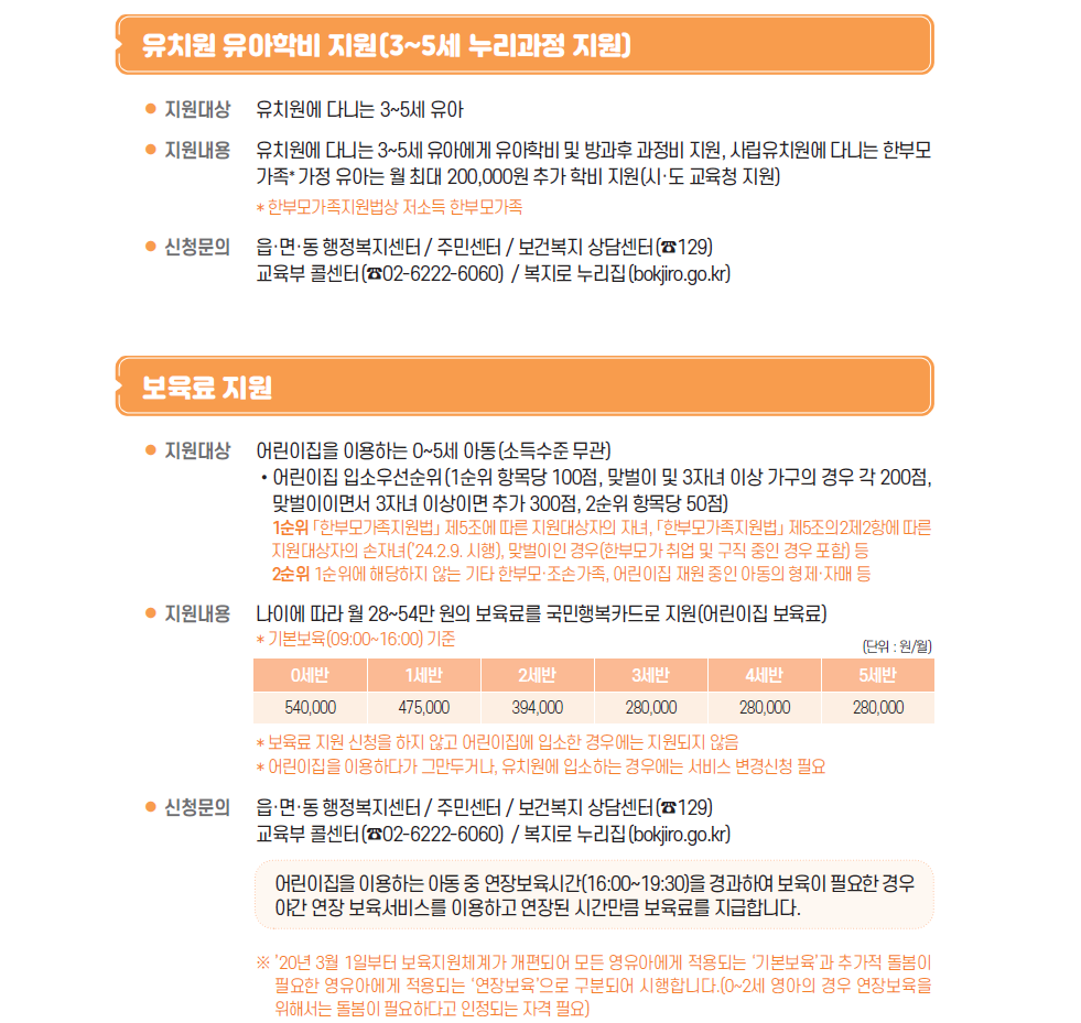 - 지원: 연령별 월 보육료 (국민행복카드), 1순위: 한부모 등